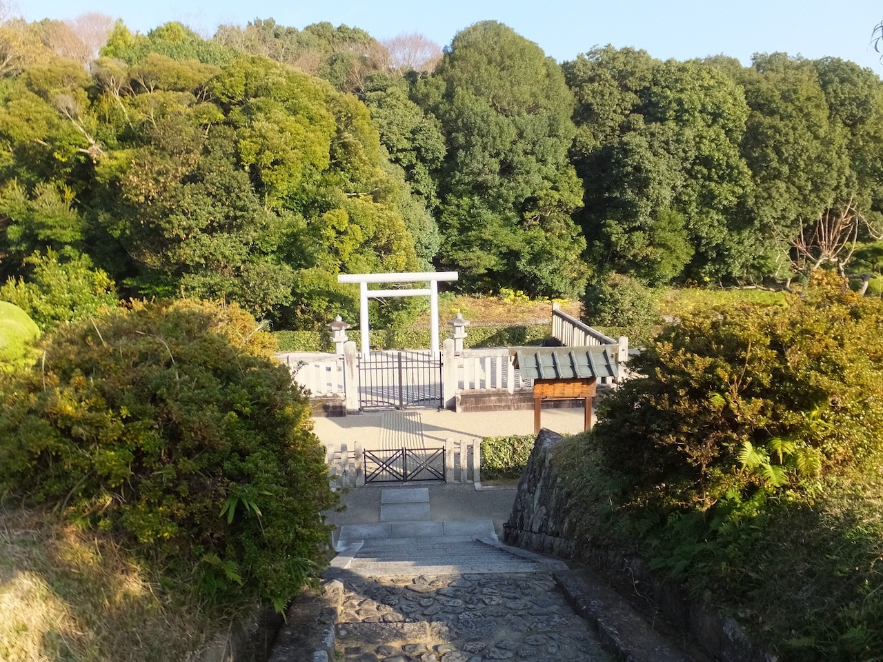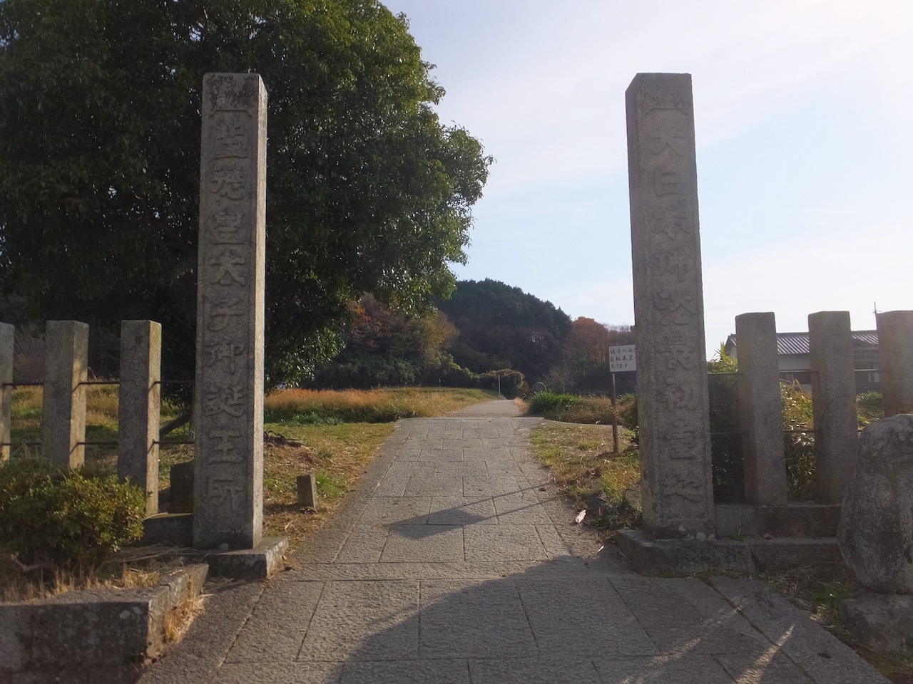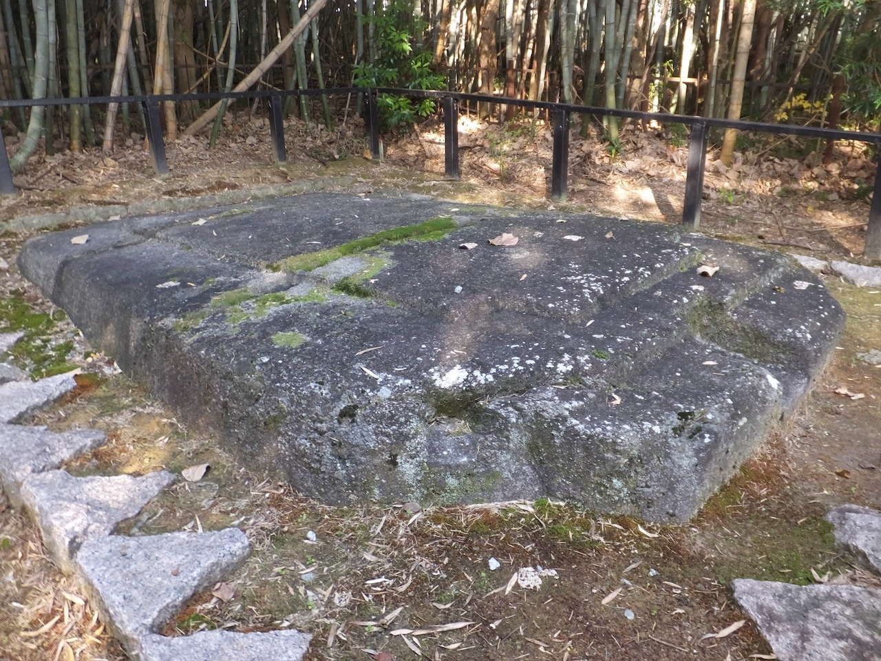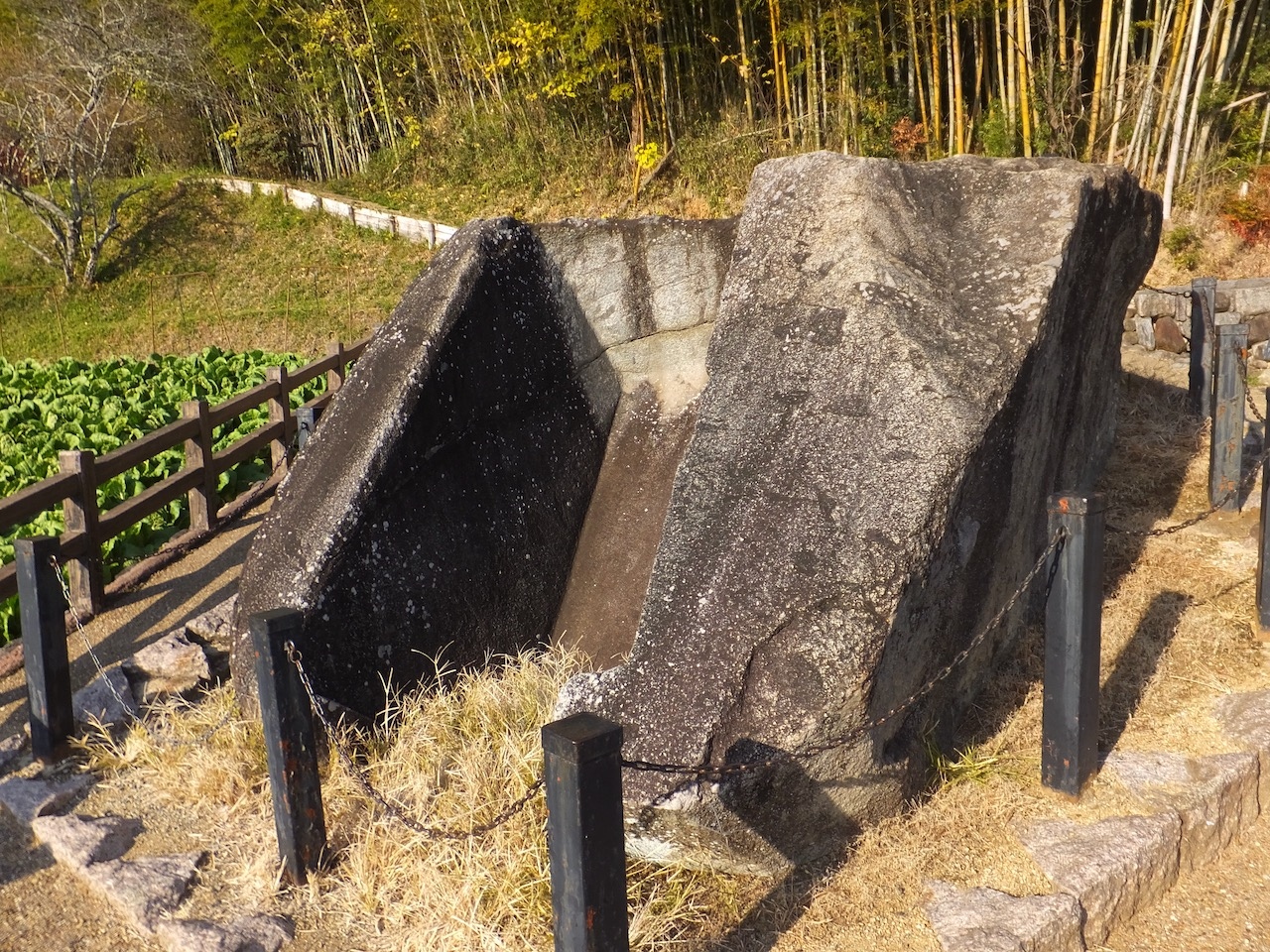 欽明天皇の妻ですが、観光地としては欽明天皇よりも有名です。ここの柵の中にある「猿石」がその奇妙な表情と2面顔で有名なためです。欽明天皇陵の脇の案内板にも「猿石」の案内があるくらい。