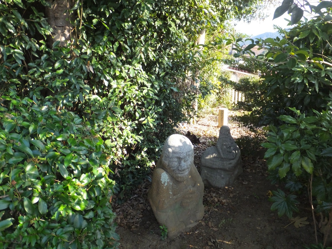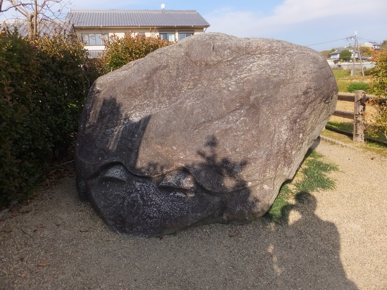 細い道端にごろりと転がった石の地面に近いところに寝顔のような顔が彫ってあって、全体としては亀に見える、という巨石。