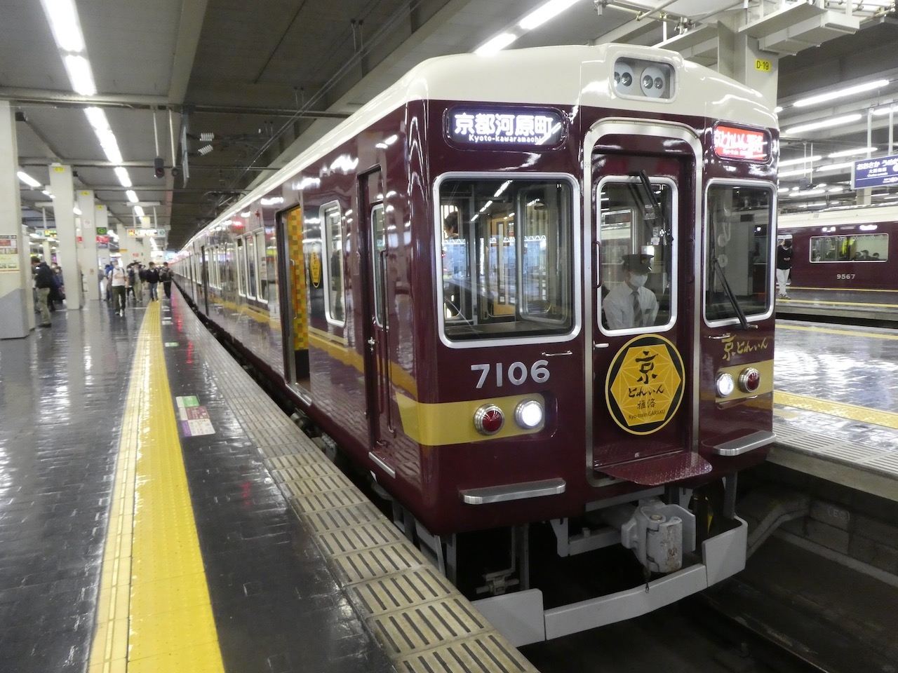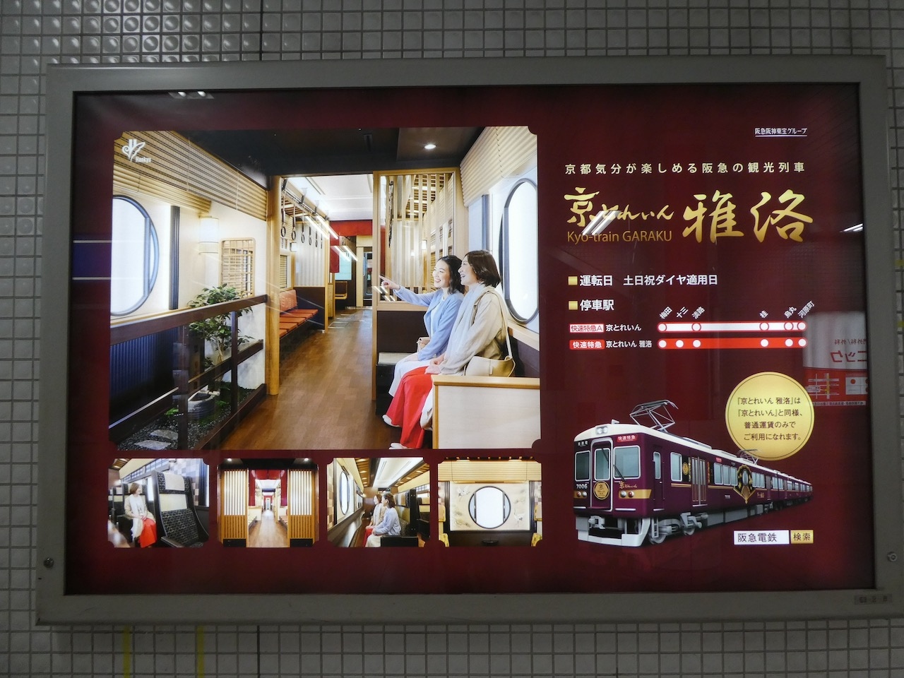 阪急の観光用の特急の愛称です。6両編成が2本あり、土休日の昼間に1時間ごとに京都と大阪を結んでいます。2本はそれぞれ座席配置やインテリアが異なります。しかも6両編成で2両ごとに3種の座席配置とインテリア。6回乗車しないと全部を体験できません。いえ、1両の中でもいろんな座席があるので、さらにその2倍くらいは乗車しないと。