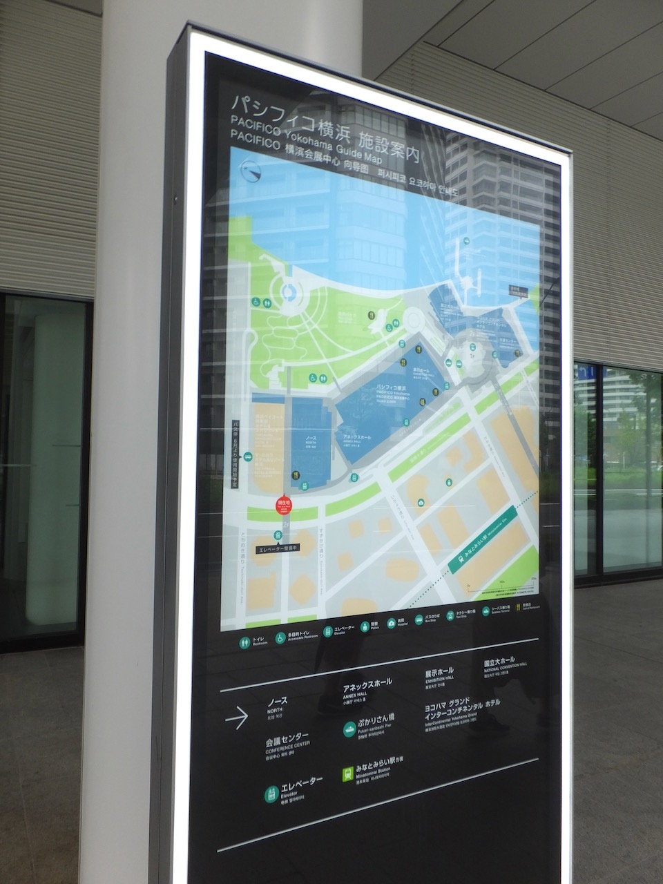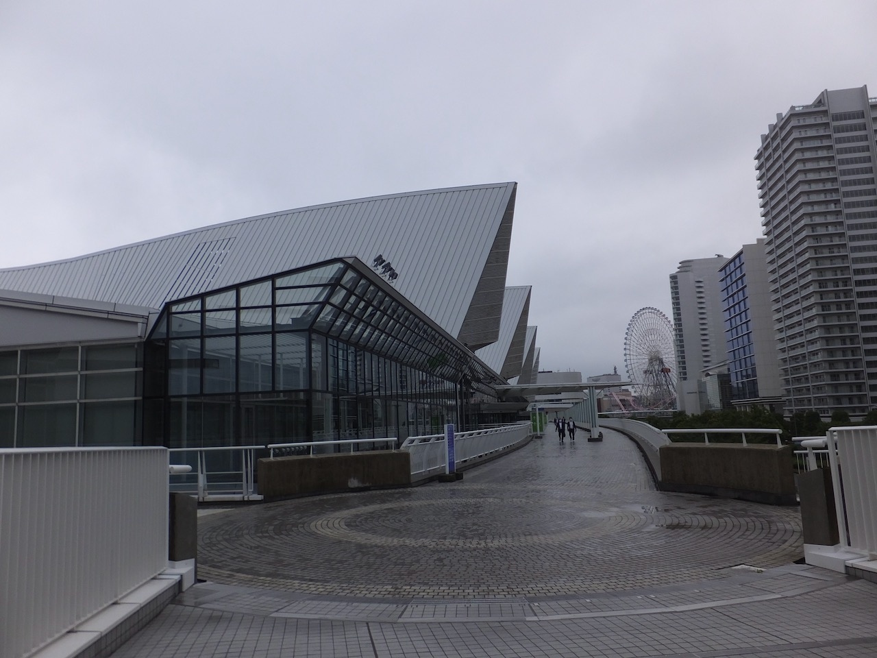 仕事関係では横浜の展示場はあまり縁がなく、バーゲンで初めての利用です。地図を見ると桜木町駅やみなとみらい駅からでなくとも横浜駅からでも15分もあれば着きそうです。そごうデパート・日産ミュージアムを抜けて海の方へ。たしかに15分で到着しました。が会場のホールが一番みなとみらい駅に近いところだったので結局20分以上歩きました。