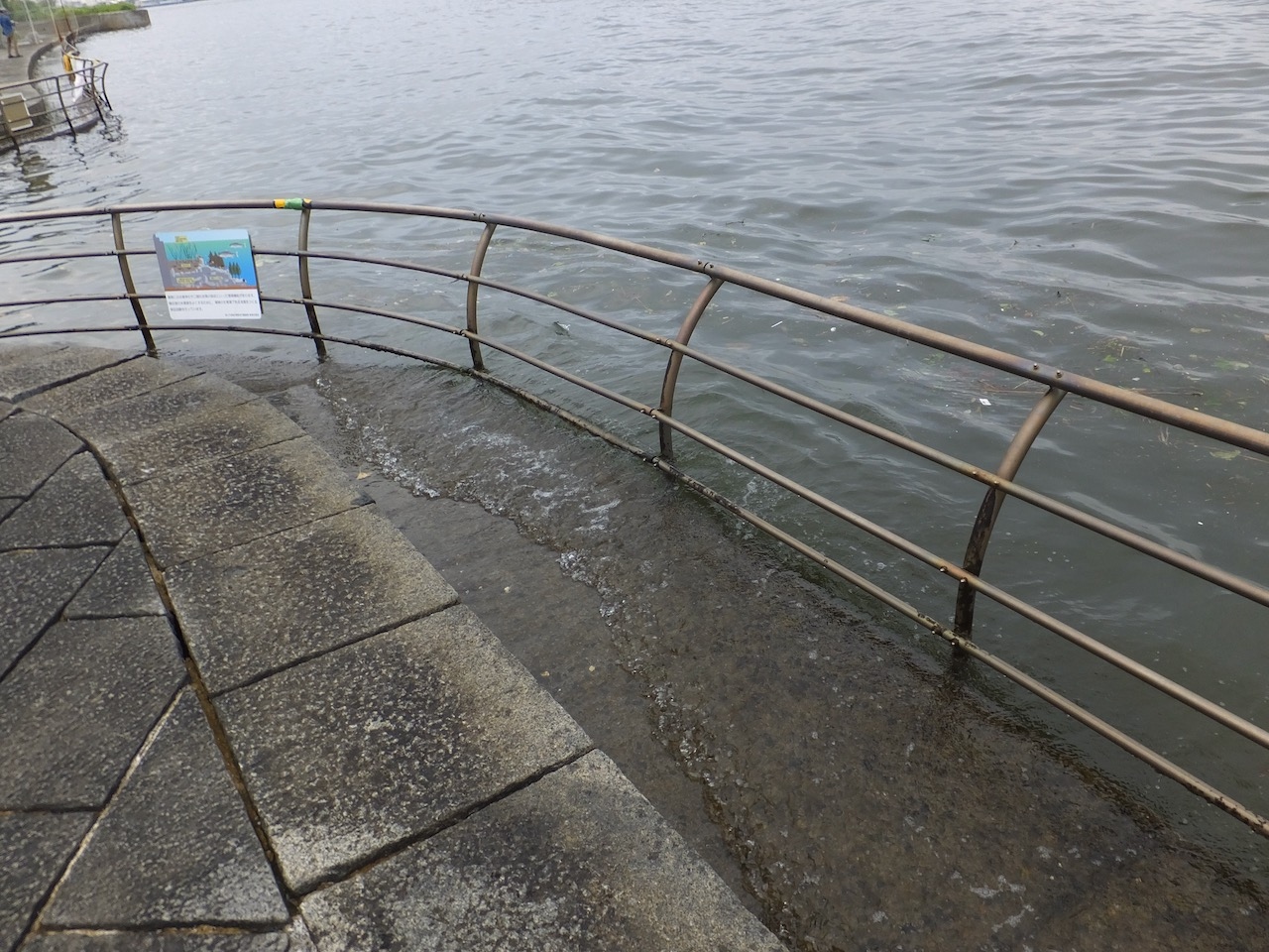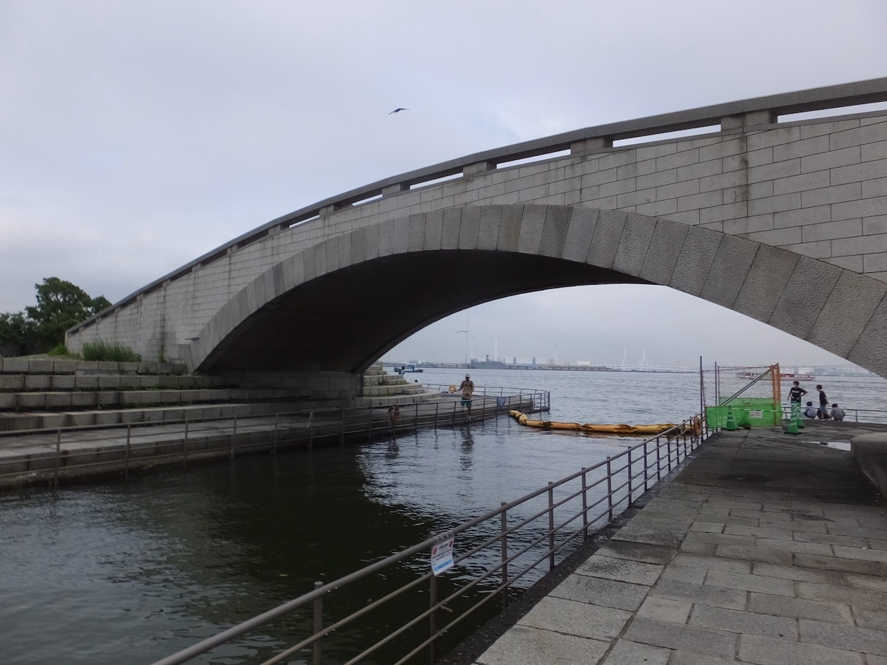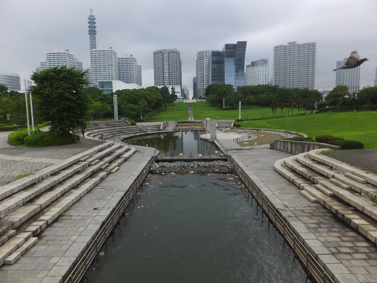 観光客よりは海釣りの人や地元の散歩やジョギングの人が目立ちました。パシフィコの端っこから長い園路で波打ち際まで10分かかりました。広いです。入り江のような人工池の上に橋がかかってますが、水の入れ替りがないのか淀んでゴミだらけでこのへんはいやなイメージですが、波打ち際まで来ると港の景色を一望に。波打ち際は柵があるものの海に触ることもできるくらい低いです。ハンマーヘッドにとまっている客船が遠いですがよく見えます。ときどき海面高くさかなが飛び跳ねます。ゆったりした時間が流れます。とくに目的もなく散歩するにはおすすめの公園でした。