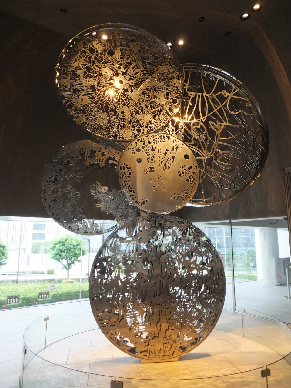 横浜駅からみなとみらいまで徒歩の場合は、そごうからこの日産のギャラリーの2階部分を貫通して歩いていくのが最短距離。なので1階のビジョンをぼっーと見たり、車の展示を見たり、5つの金色のホイールが組み合わさったオブジェを自由に見ることができます。大会社の本社ビルなのにこんなに気軽に入れるのは素晴らしいです。