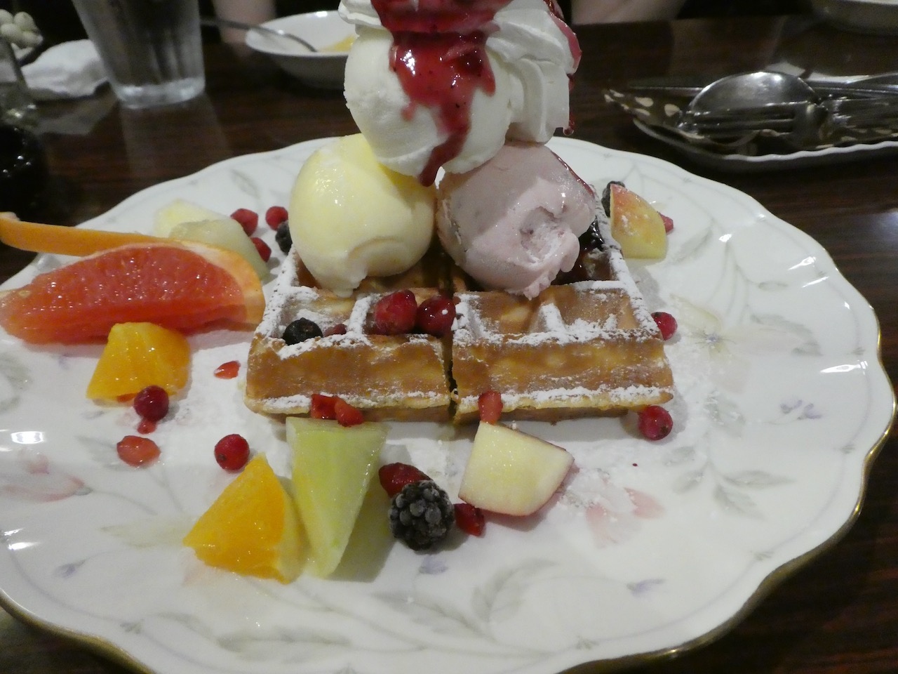 今回は夜だったので食事系を。ワッフルですがドドーンという感じでアイスやクリームも山盛り。