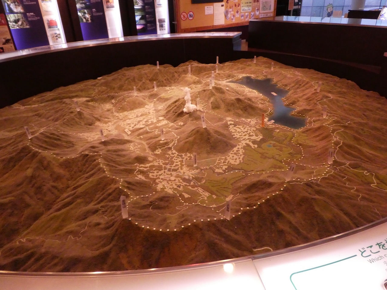 展示、一番よかったのは立体のジオラマ。箱根火山は二重火山で、内側のカルデラがわかりにくいのですが、あまりそのあたりは表現されてないですが、火山の全体像がわかるのはいいです。