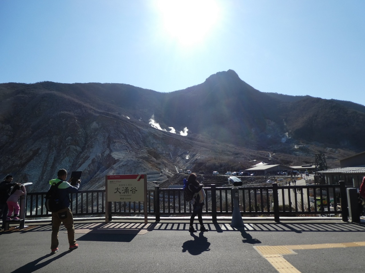 箱根火山の噴火口。爆裂火口なのでおわんのような形ではなく、山がえぐれたような形です。その上をロープウェイがゆく。火山観光のメインのような場所です。数年前小規模の噴火をしたので、現在も遊歩道は上の方は閉鎖されています。が、観光用の展望台とそのまわりはOKなので観光にはあまり影響ないです。