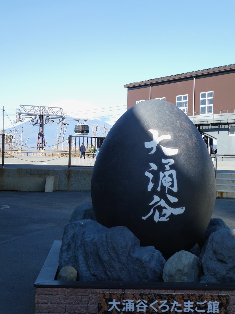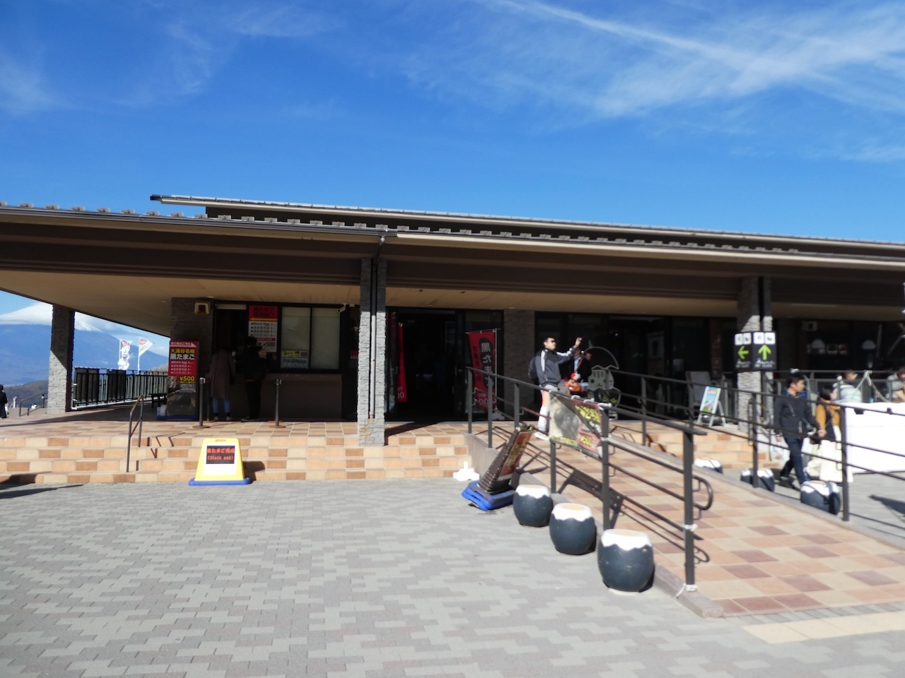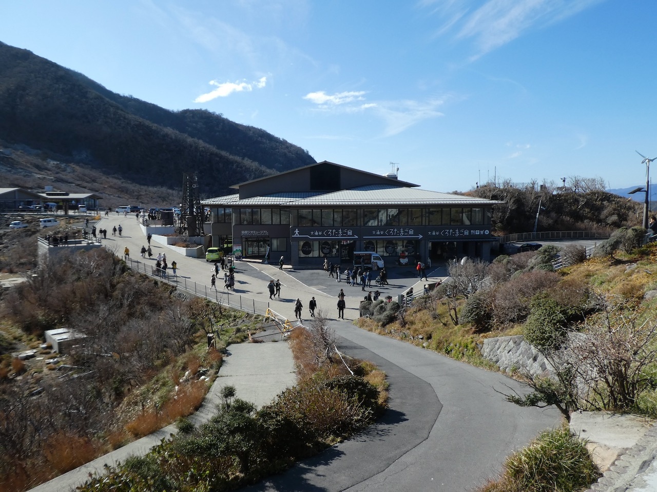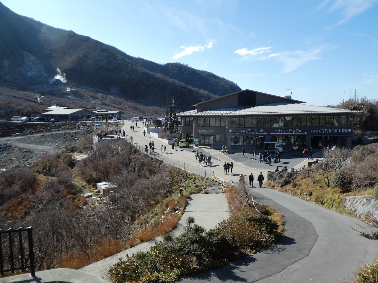 大涌谷に大きな建物は3つ。ロープウェイの駅から2分くらいゆるやかな坂道を下って登ったところ。建物自体も黒いのですぐわかります。