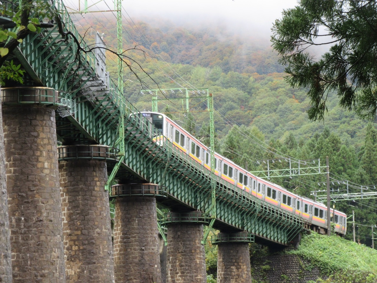 今回は車の旅行だったので谷川岳を超えるあたりで写真撮影を。土樽駅近くの「毛渡沢橋梁」です。高い石積みの橋脚にプレートが乗った華奢な感じのする鉄橋です。コンクリートの橋脚は新しく増設した下り線です。上り列車を待ち構えて撮影してみました。川の音にかき消されて電車の接近音が全く聞こえず、失敗しました。