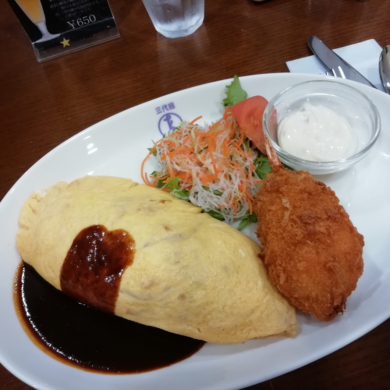 オムライスが有名とのことで、オムライスとカニクリームコロッケのセット1550円を注文しました。カニクリームがカニの爪付きで本格的なお味でした。オムライスは、洋食屋さんの味という感じでおいしかったです。- 旅行時期