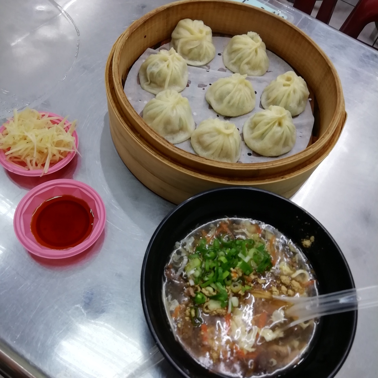 酸辣湯はうどん丼くらいの大きさで先に出てきました。小籠包は、葱がたくさん入っていて珍しい味でした。8個入りでぺろっと食べてしまったので、もう1籠追加しましたが、さすがに1人で16個はきつかったです。- 旅行時期