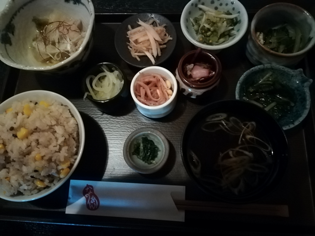 野菜のおばんざいの小鉢がいくつか並んでいますが、ご飯と汁物以外は