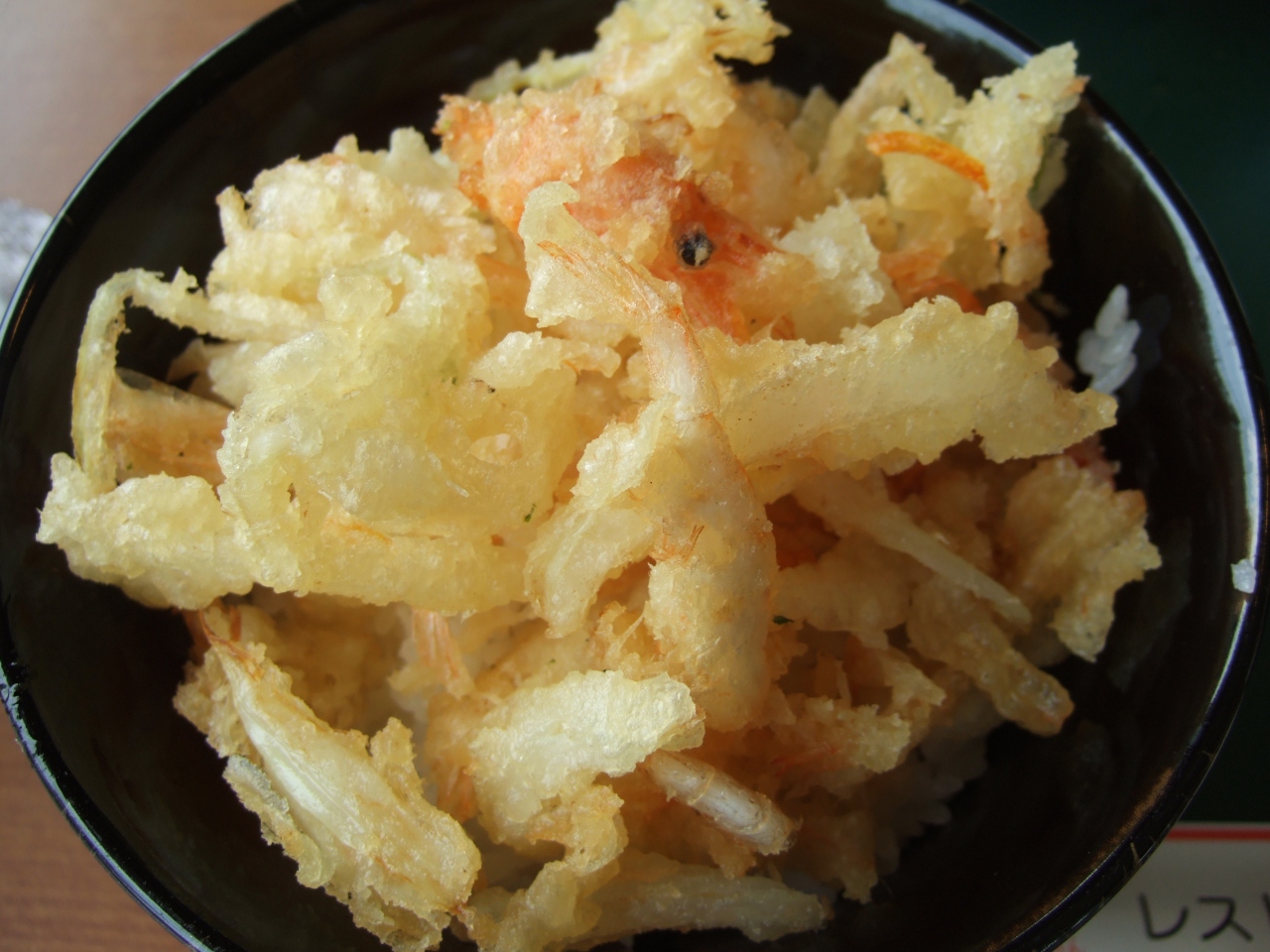 ここの白海老天丼はサクサクでお味噌汁と漬物、サラダがついて730円と