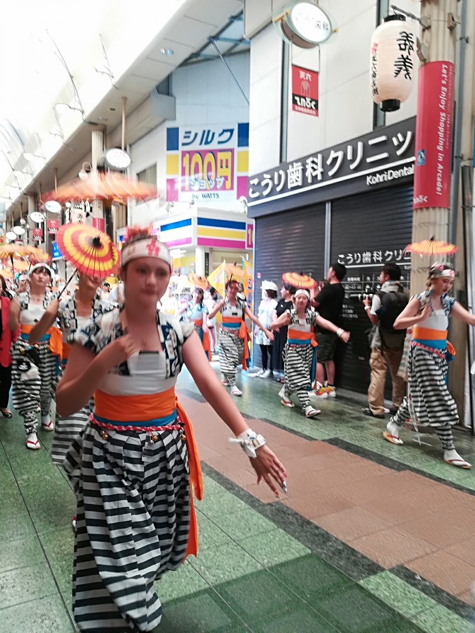商店街の向こう側からパレードも始まり、暑さは厳しかったのですが