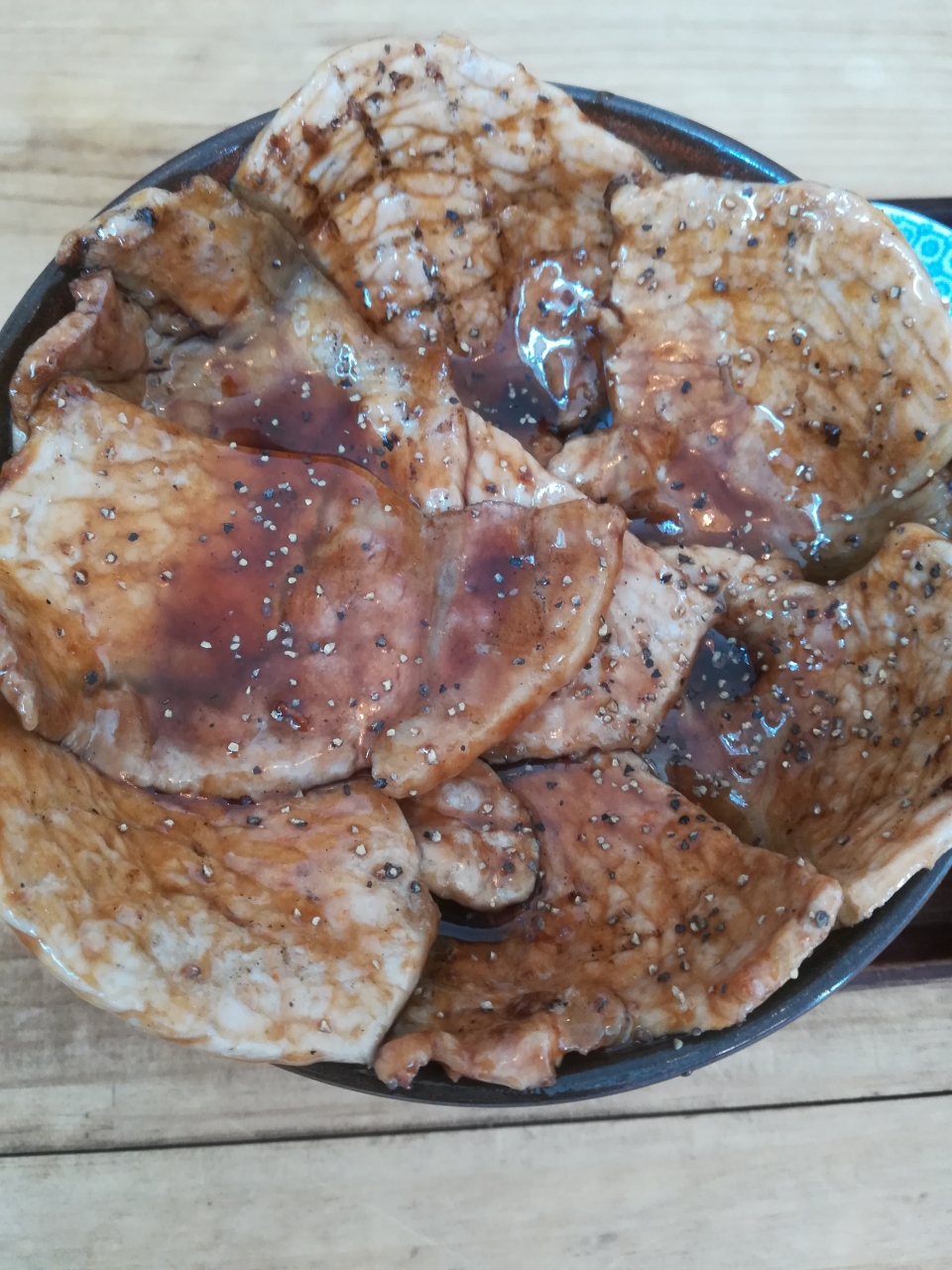 バラの様に盛られたバラ肉のぶた丼には自家製の甘すぎないタレがたっぷりと。