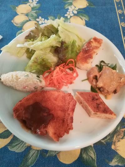 最初に出てくる前菜にはチキンカツやオムレツなどが1プレートに入っています。