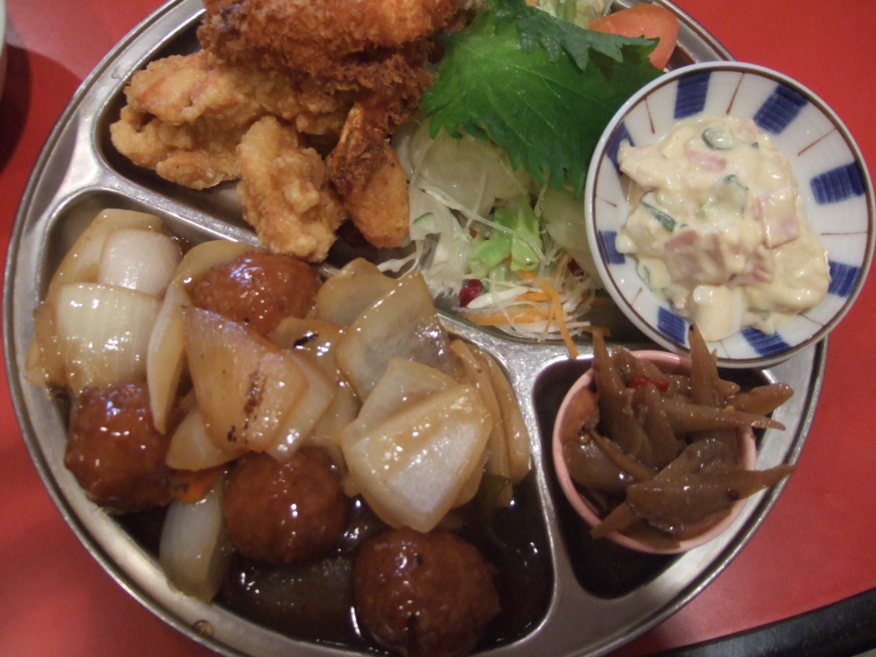 唐揚げ、酢豚、海老フライやサラダ等。コスパ最高です。