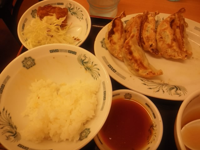 餃子二人前に唐揚げ二つ、あと、ライスとスープが付いて600円でした。