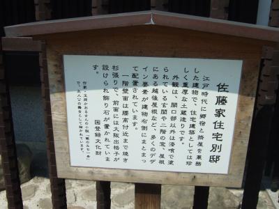 その外観は、屋根にある越屋根をはじめ漆喰で塗られた玄関などの主なデザイン要素は建物の右側にまとめられて配置されています。また、一階の壁は腰の高さまでの焼き杉板張りになっており、軒下と道の間は名栗棒で作られた大阪出格子が設けられています。飾り石を玄関に配置するなど、播州地方や生野では珍しいデザインが採用されており、佐藤家住宅は建築構造、外観ともに珍しく特徴的な建物になっています。- 旅行時期