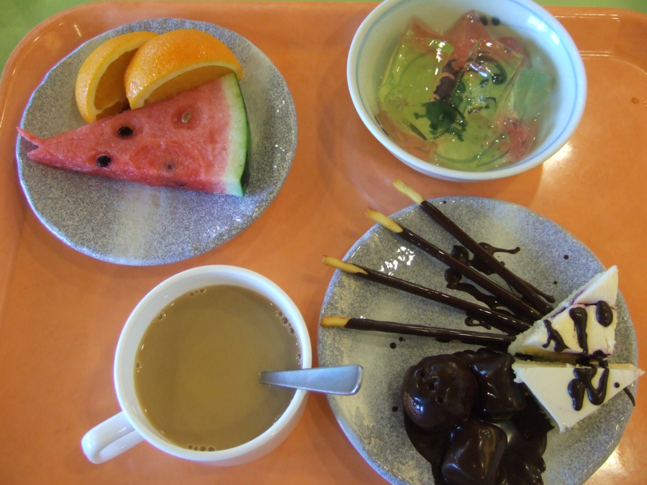 デザートはスイカ、オレンジ、ゼリー、ケーキ2種類と一番楽しかったのはチョコレートファウンテンでした。