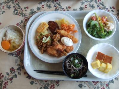 内容は野菜の天ぷらや唐揚げ、シューマイ、鱒のフライ、エビフライ、パスタ、焼きそば、オムライス、冷たいうどん、そば、サラダ。