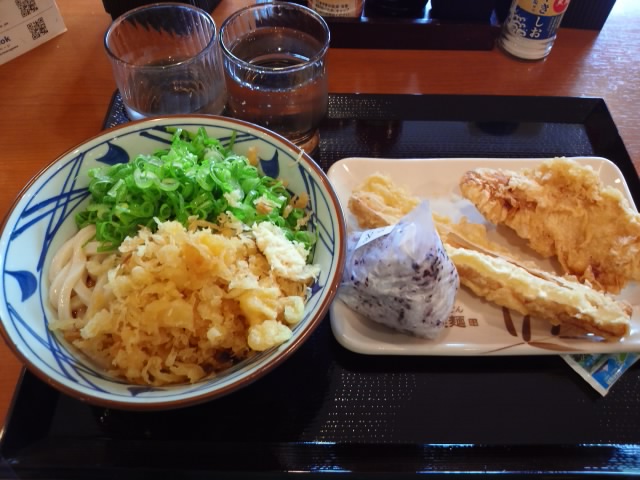 この日はぶっかけうどんと天ぷら2つ、おにぎりを食べました。