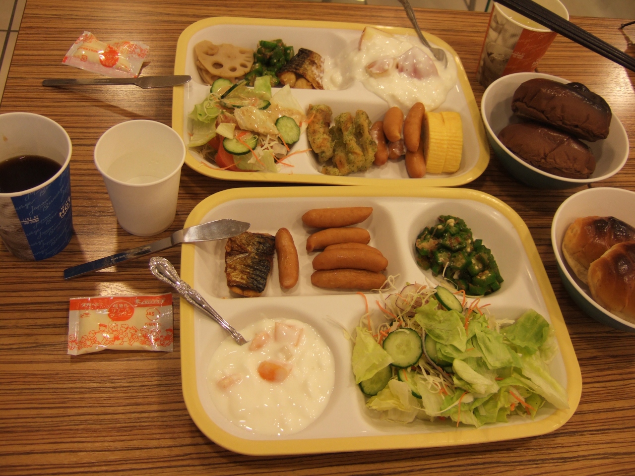 朝食はソーセージ、玉子焼き、焼き魚やごはん、パンがあり