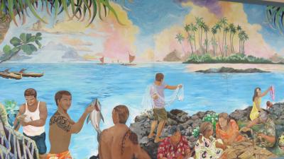 お店の外壁に架かれているペイントが素晴らしく、ハワイの昔の暮らしを