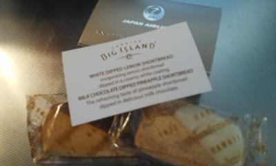 ヒロでは店舗に行く事が出来なかったのですが、なんと帰りのJALの機内食の中に箱に入ったチョコクッキーが出ました。