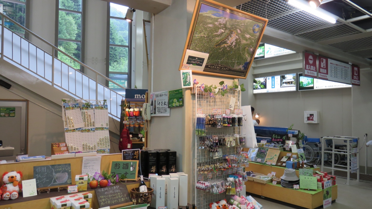 ロープウェイ乗り場の下には売店があり、モンベルのコーナーやお菓子などの