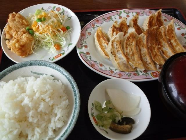 餃子が2人前入った餃子セットは780円でから揚げ、ご飯、味噌汁が