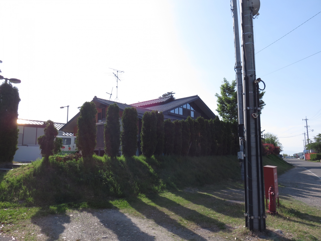 目印は赤い柱だけのたてものです。