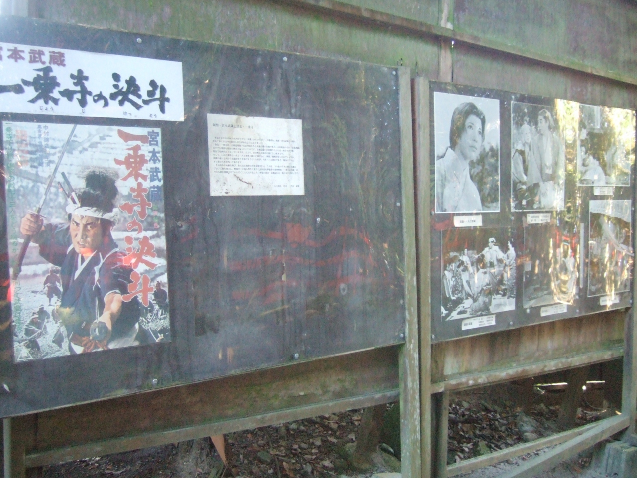 神社の入り口のパネルには向かす上映された一乗寺の決斗の