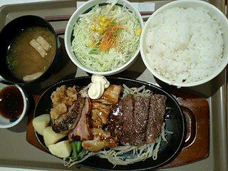 お店が10軒程あり、迷いながら友達とシェアしてのランチ。その中でもボリューミーなやよい軒のお肉&チキン&ハンバーグのセット980円を注文。