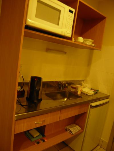 近くにデレーズという品ぞろえの良いスーパーマーケットがあり、食材を買って帰って、キッチンで料理して食べられます。電子レンジ、コンロ、湯沸かしポット、各種キッチンツールが揃っており、便利です。