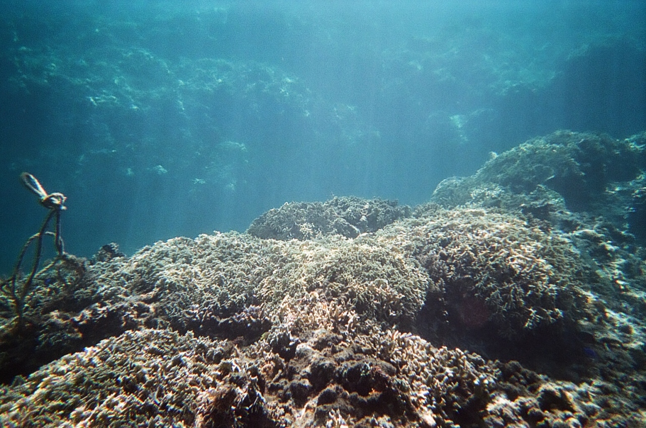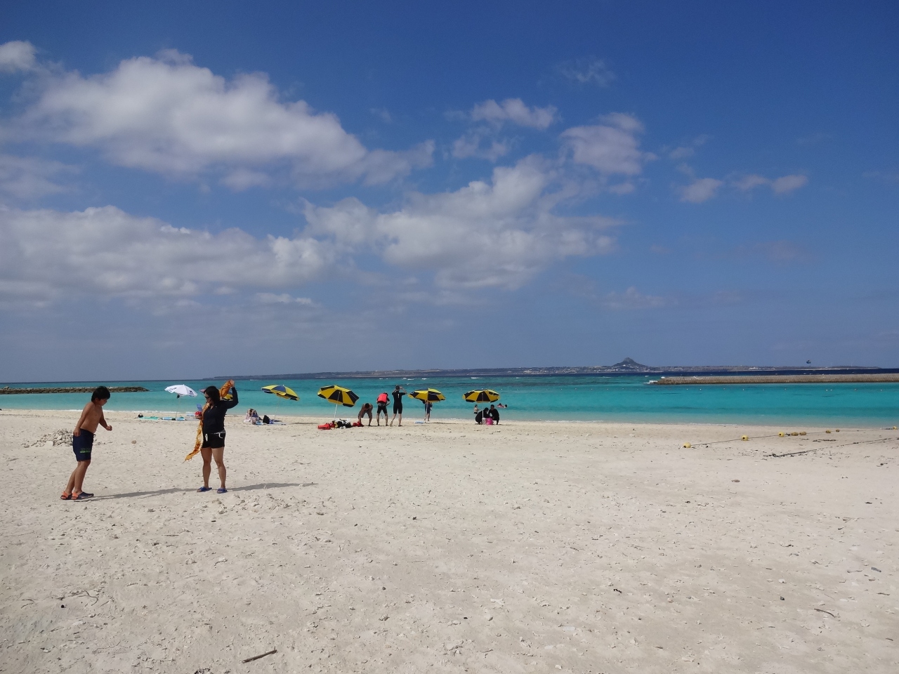 透明度も高く、シュノーケルに最適!!と色々な所で紹介されているので思いっきり期待していきました。リーフに砕ける波。白い砂浜、遠くに浮かぶ水納島、伊江島、景色はすごく綺麗で、沖縄のビーチと言う感じです。ただ、肝心の海の中が。。。。。遊泳区域は干潮時のためか、人が多いためか海はにごっていました。(もちろん湘南の解す浴場よりは綺麗ですが。)また、珊瑚は死滅していて見るも無残な姿です。魚はあまりいません。ボーッと浮かんでいたら、ハギの仲間に足を突っつかれました。餌付けされていて、私の指をソーセージと間違えた様子です。遠浅でくらげよけのネットが張ってあるため、海水浴をするには安全でいいところです。