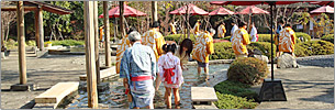 外の足湯エリアは庭園となっていて風情があります。この足湯は浴衣のまま楽しめて浸かるというより歩くタイプなんですが、気持ちいいほど痛いです。