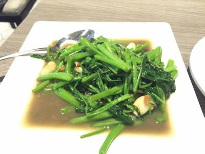 大好きな空芯菜のガーリック炒めを。ビールすすむ!