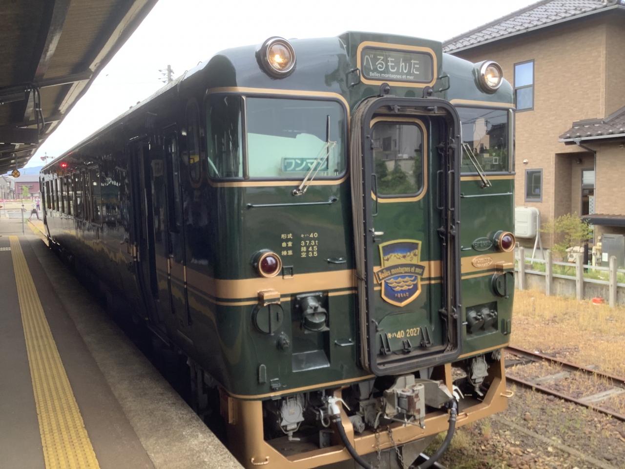 富山県高岡駅を起点に運行しているJR西日本の観光列車「ベル・モンターニュ・エ・メール」通称「べるもんた」に乗りました。
