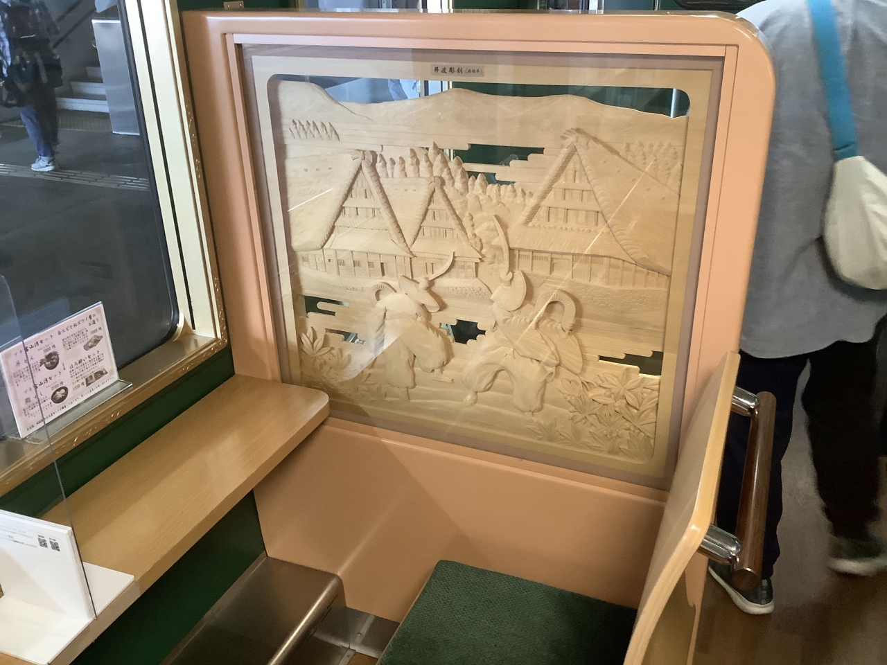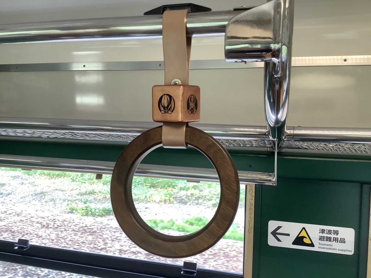 車内は沿線の伝統工芸品「井波彫刻」や「高岡銅器」をイメージした吊り革の装飾物が特徴的です。