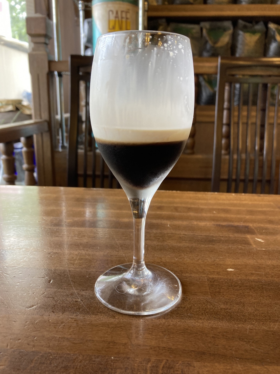 「琥珀の女王」と名付けられたアイスコーヒーはコーヒーと生クリームが二層になっていて飲み進めても混ざらずに二層のままのアイスコーヒーです。