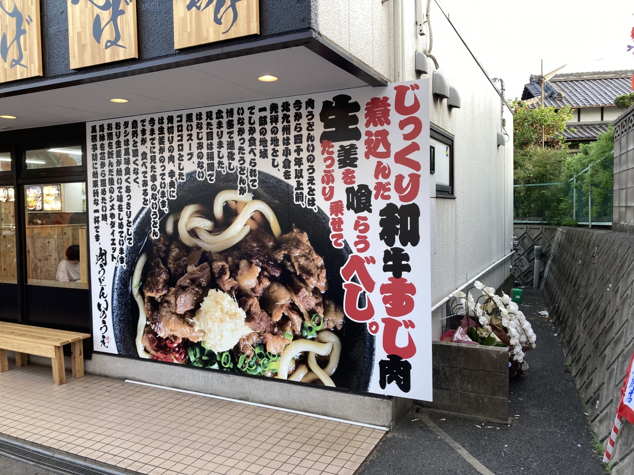 福岡県京都郡みやこ町勝山黒田にオープンした「肉うどん いのうえ」の2号店で、牛のほほ肉・すじ肉・バラ肉がゴロゴロ入った小倉名物肉うどん「どきどきうどん」を販売している。