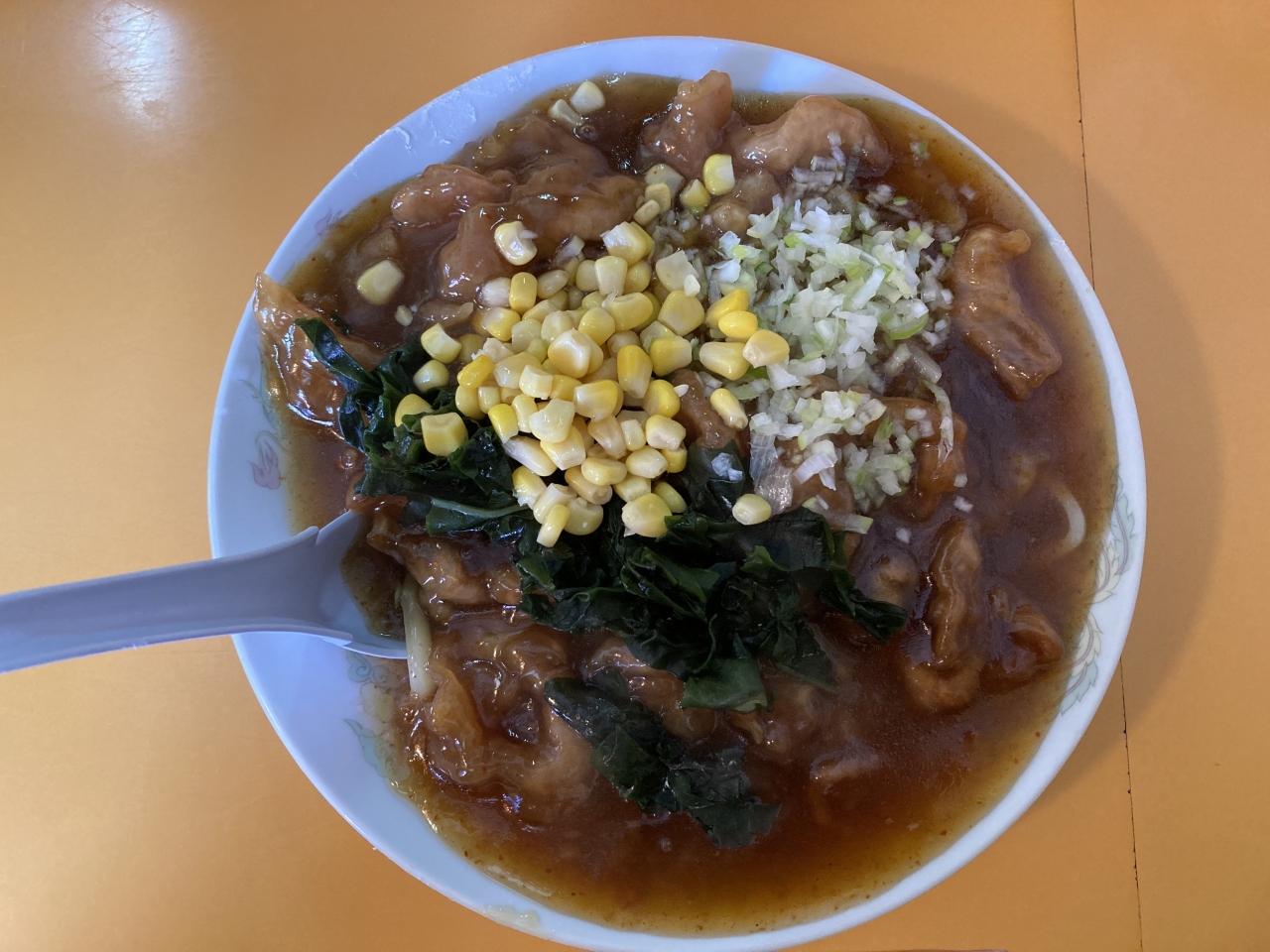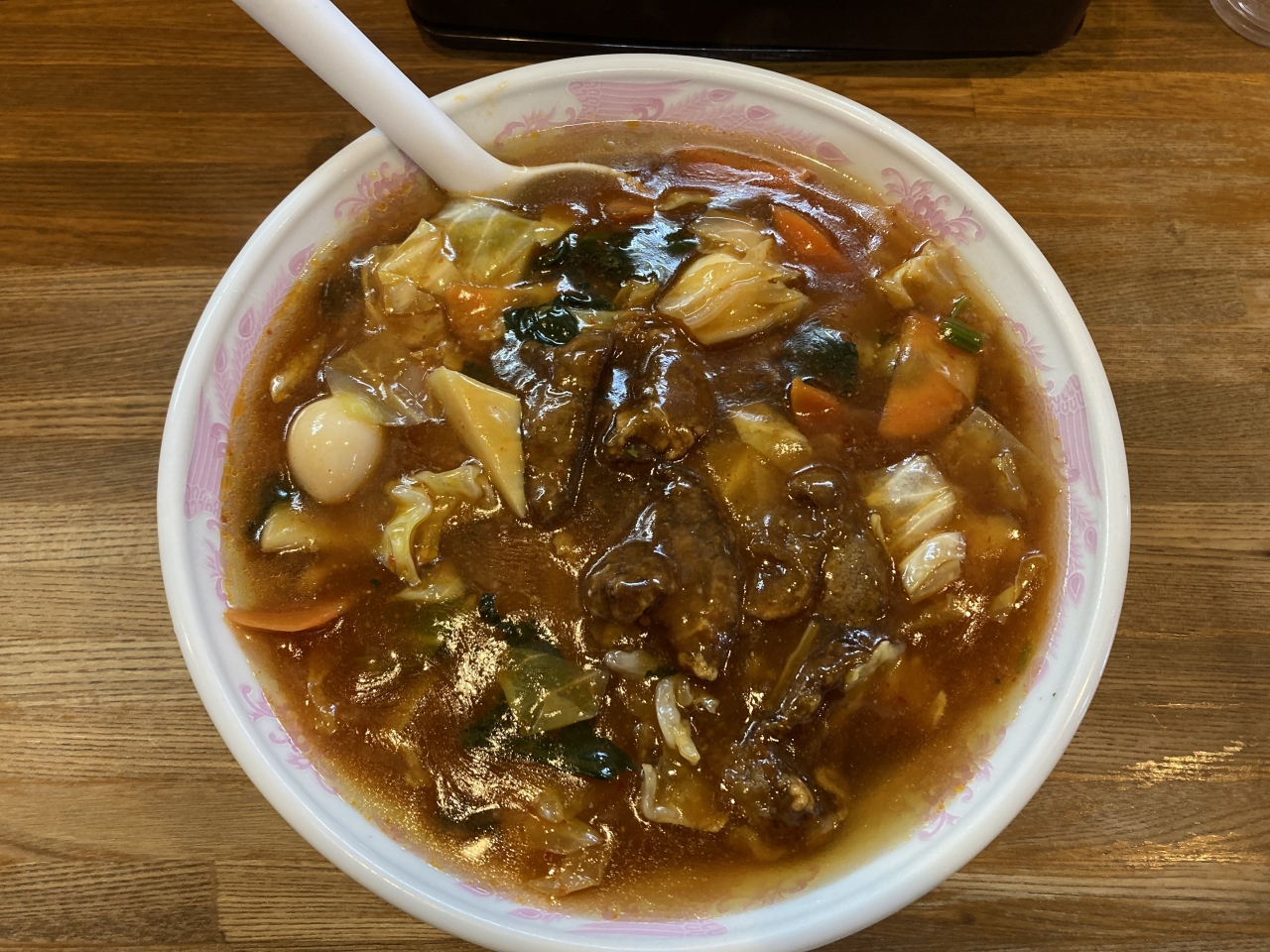 茨城スタミナラーメンは麺の上に甘辛いあんかけが乗っており、
