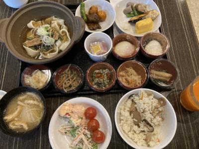 朝食の地元名物に穴子飯、温麺(にゅうめん)、アーモンドトースト、デミカツ。