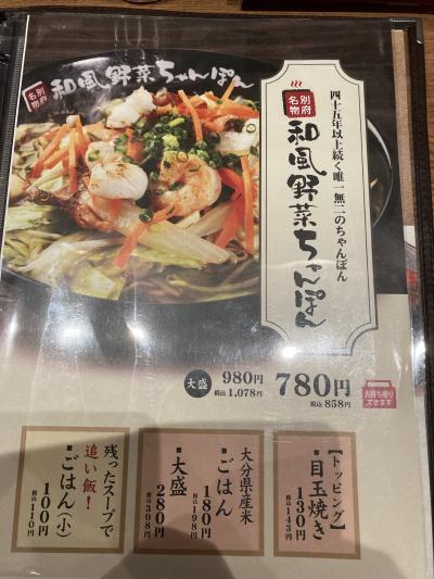 とも違う別府温泉のちゃんぽんは、鉄板焼きの鉄板で野菜・肉などと麺を焼きそばみたいに炒めてカツオ・鶏・豚