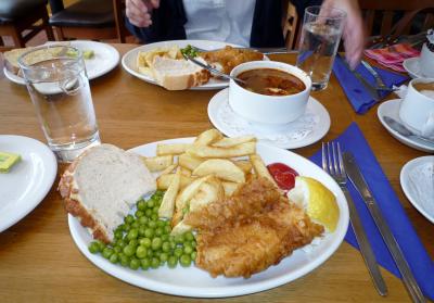 ・ランチセット:フィッシュ&チップ(パン付)、コーヒー、デザート