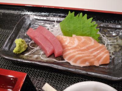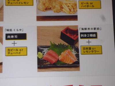 日本酒かレモンサワーのどちらかに、刺身2種類が付いています。