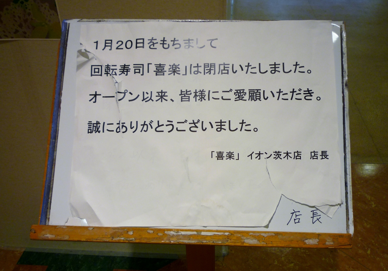 大人気の回転寿司喜楽ですが、イオン茨木店は1月20日をもって閉店しました。