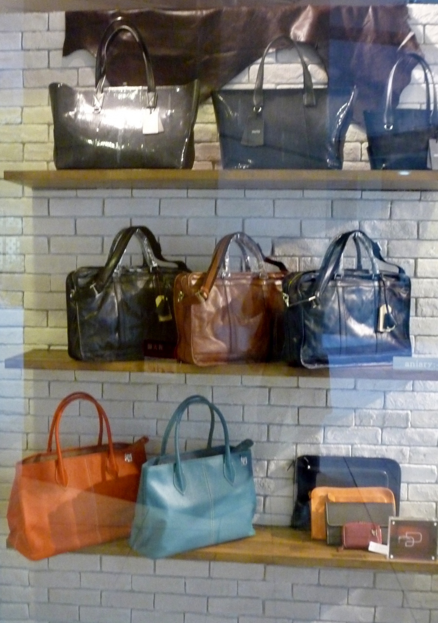 ショーウィンドーには個性的なバッグが飾られています。