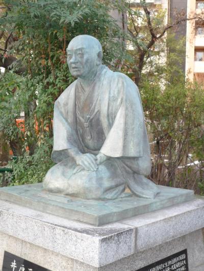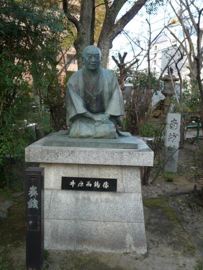 しかし、井原西鶴の立派な像があり、まるで語り掛けるような表情をしています。