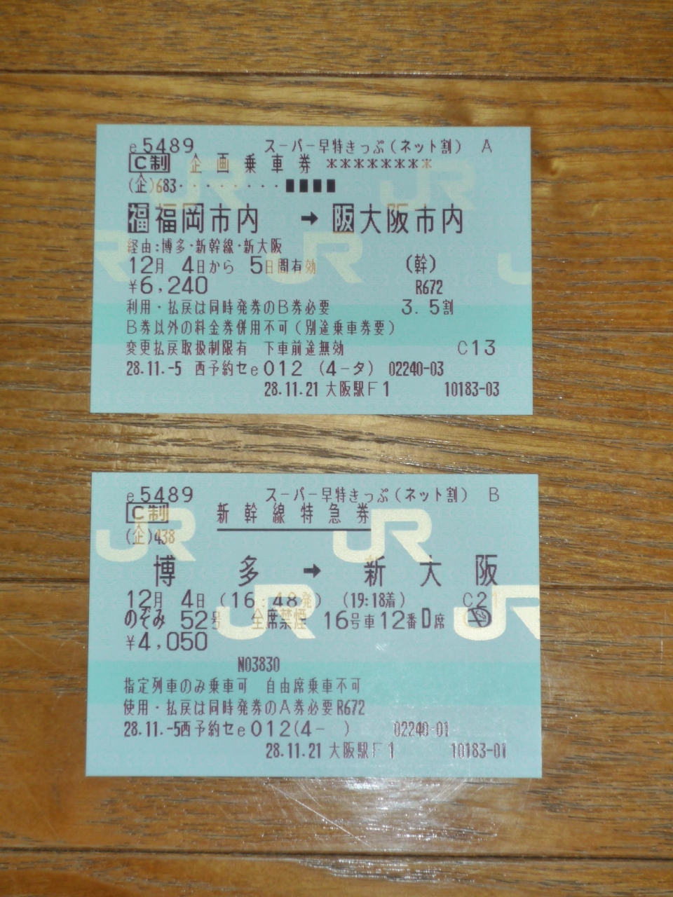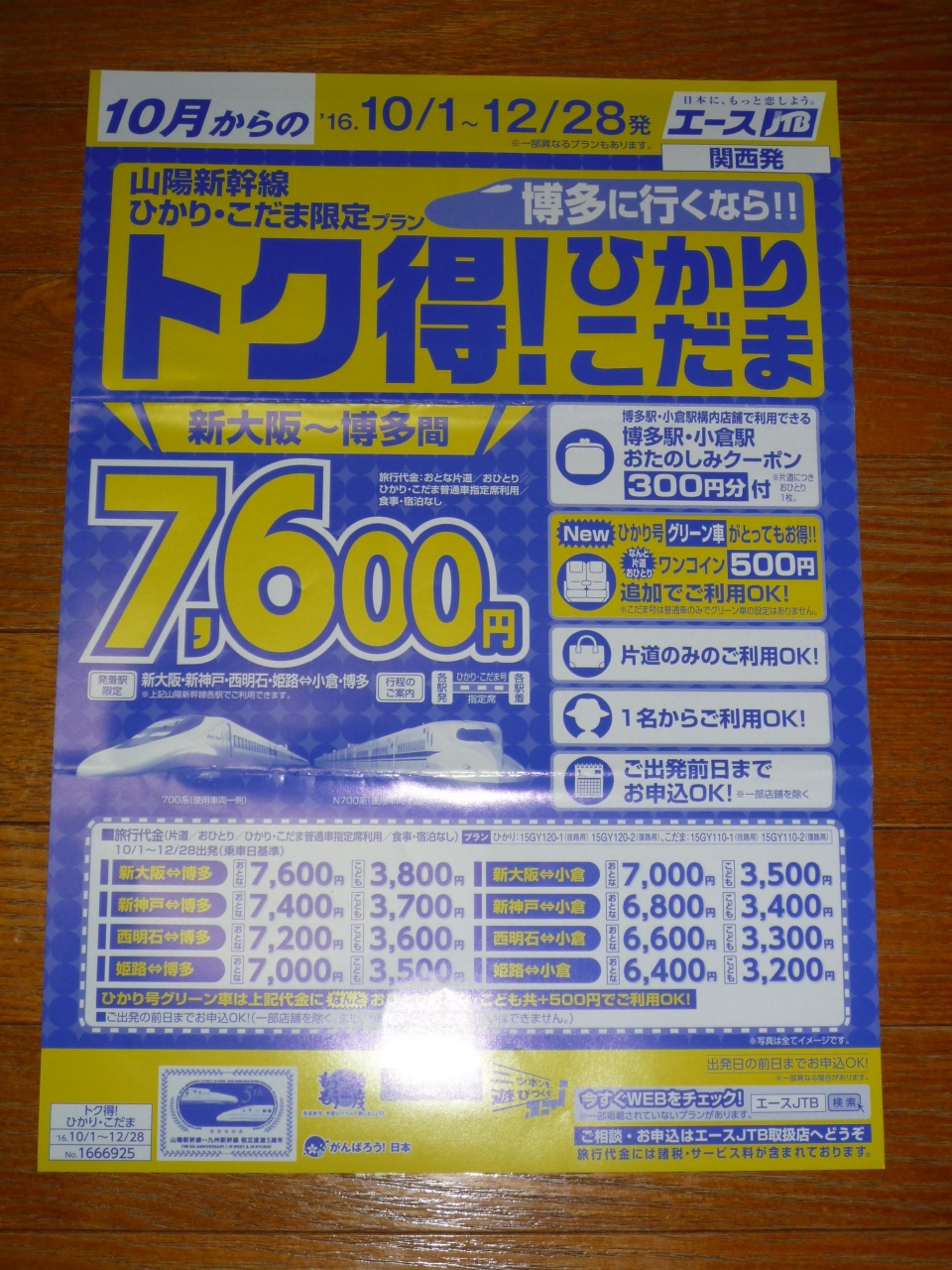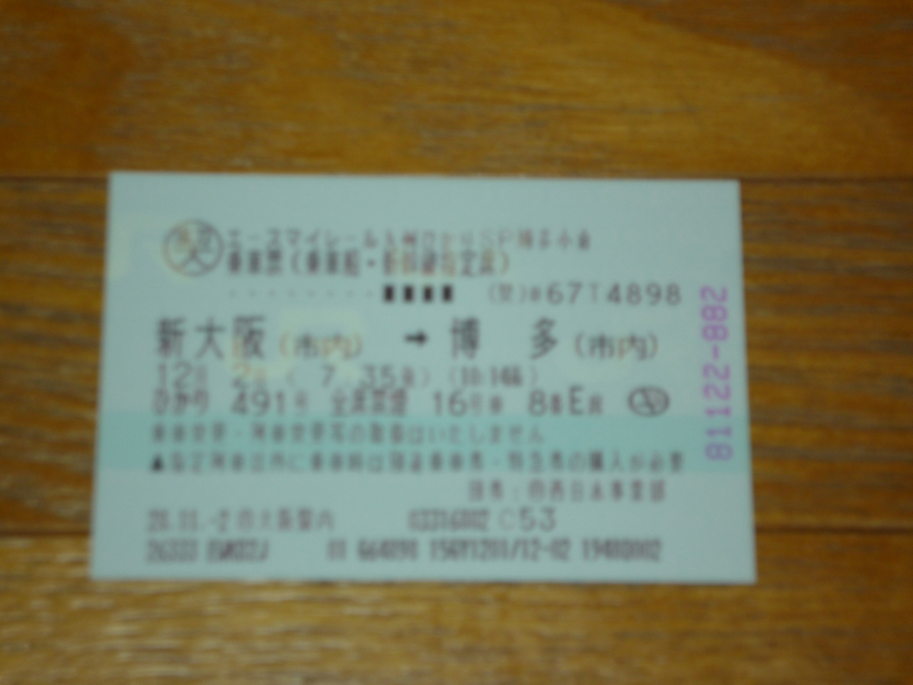 新大阪-博多 7600円(お楽しみクーポン300円付)を購入しました。