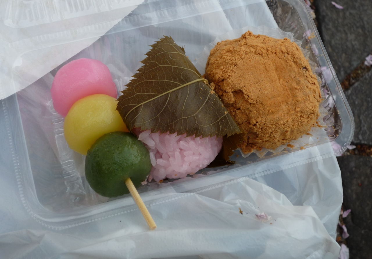 今回は、三色団子、桜餅、きな粉おはぎを買いました。
